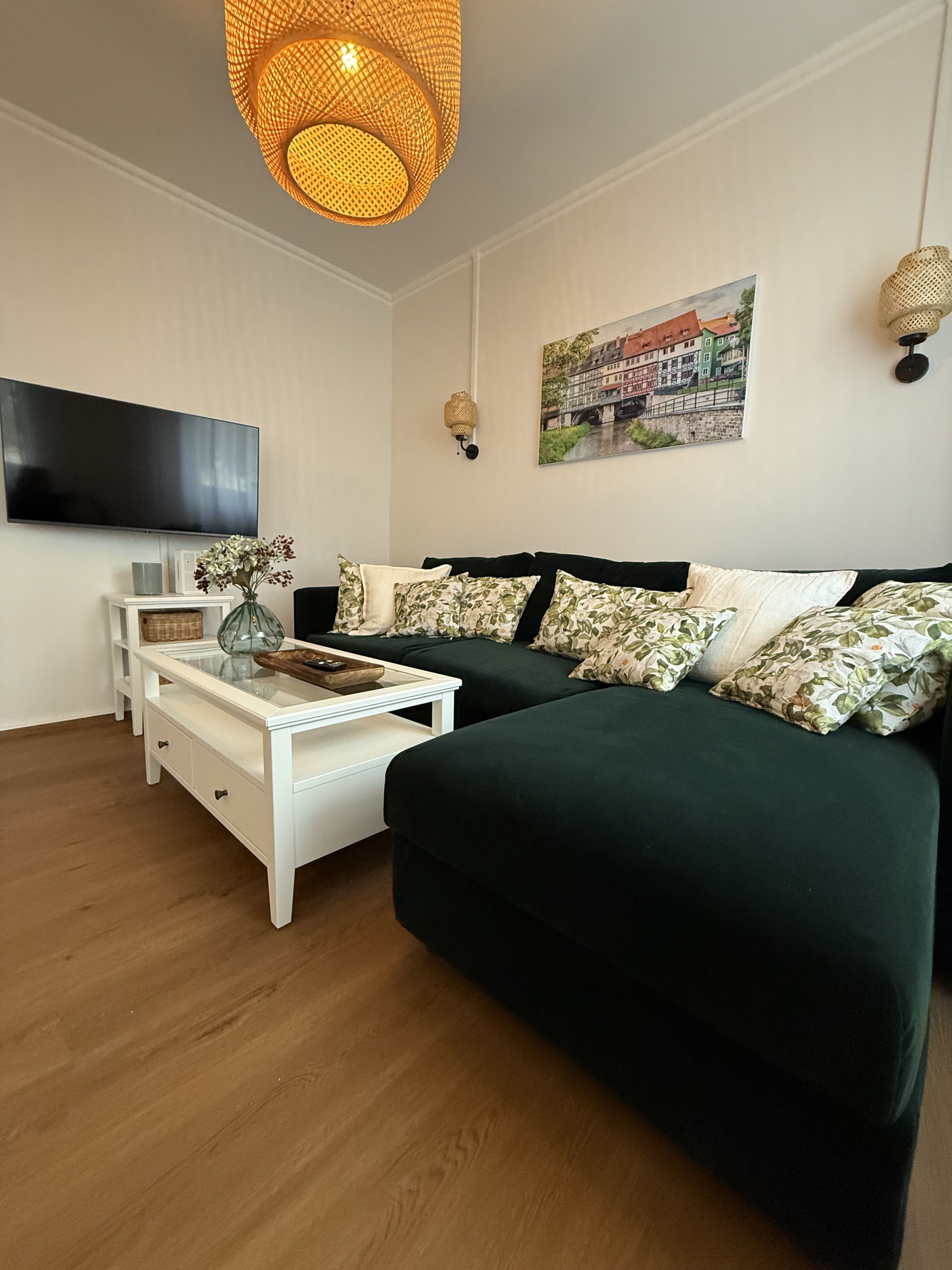 Die Gestaltung der Wohnung wurde inspiriert von 700 Jahren Krämerbrücke in Erfurt. Dieses besondere Stück Stadtgeschichte spiegelt sich in vielen Details wider: In der Küche lädt eine gemütliche Sitzecke mit charmanten Vintage-Elementen zum Kaffeetrinken und Verweilen ein. Auch das Wohnzimmer versprüht mit seinem warmen Holzton, den abgestimmten Farben und den liebevollen Accessoires eine ganz besondere Wohlfühlatmosphäre.